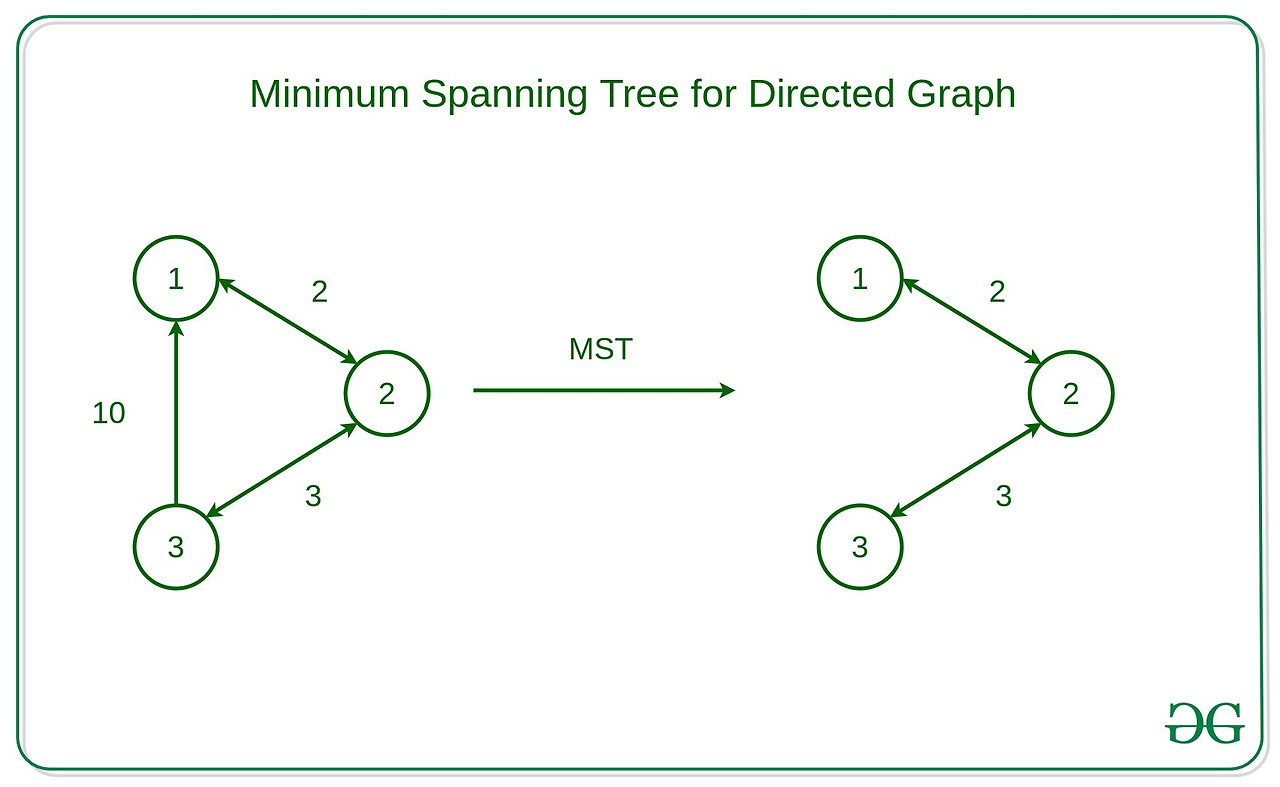 - N개의 정점이 있다면 MST의 간선 개수는 N-1개 --> 위 그림을 참고하면, 3개의 정점(노드)와 2개의 간선으로 이루어짐을 알 수 있다.